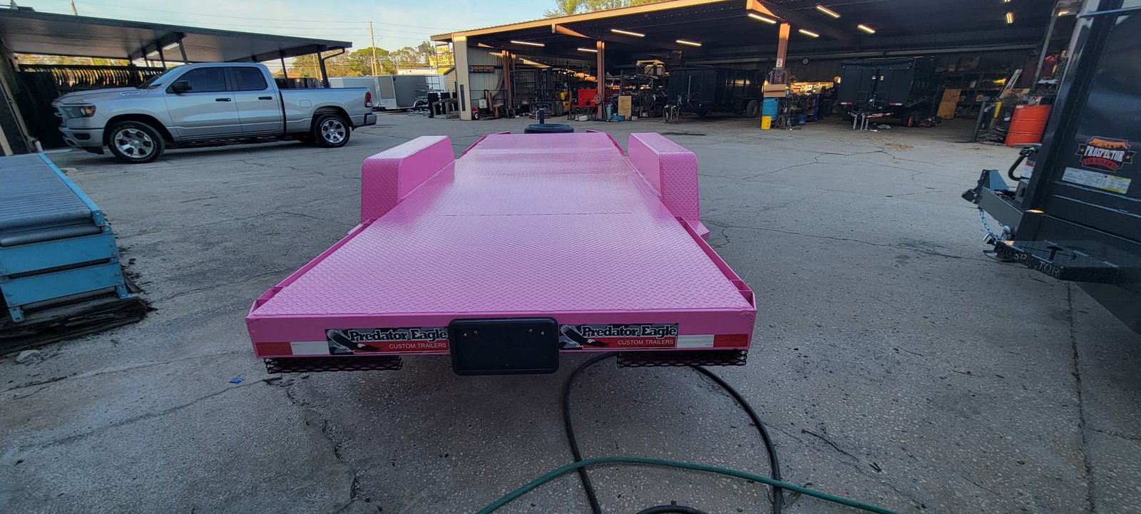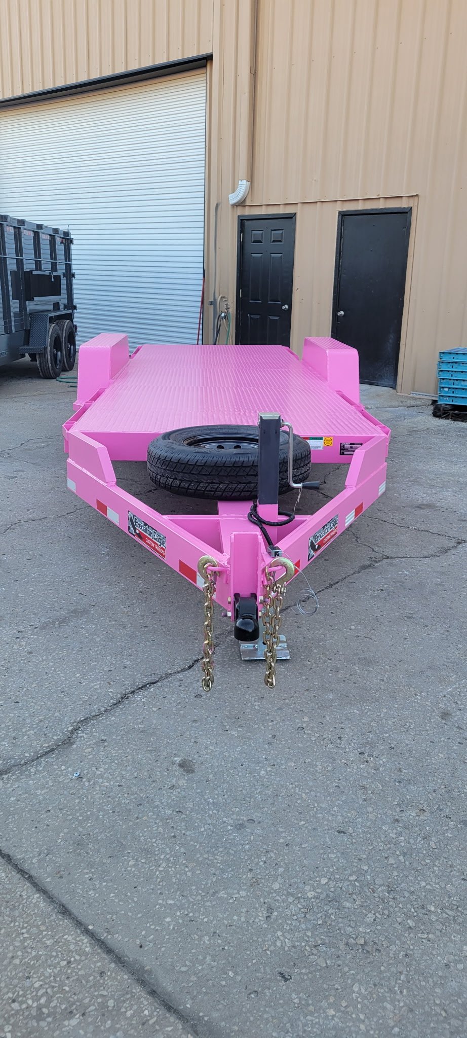 This trailer was built for a customer that wanted a custom size trailer to fit in tight spaces on job sites. The trailer was built to handle 14k gvwr and painted pink to match his business.